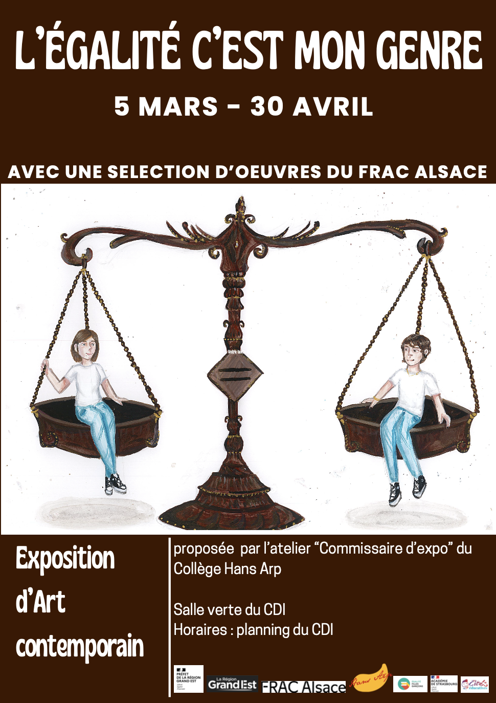 Le collège Hans Arp et l’équipe de l’atelier « Commissaire d’exposition » présentent, du 5 mars au 30 avril, l’exposition L’égalité c’est mon genre ! à partir d’une sélection des œuvres de la collection du FRAC Alsace.